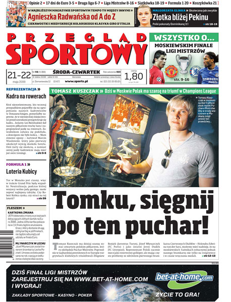 Dziś w Moskwie Tomasz Kuszczak ma szansę na triumf w Champions League - 9 stron poświęconych finałowi Ligi Mistrzów; Polsat, zmuszony przez UEFA, pokaże na żywo 27 meczów Euro w ogólnodostępnym paśmie; wspomnienie o Ryszardzie Kuleszy; drugie zwycięstwo polskich siatkarek w kwalifikacjach do igrzysk.