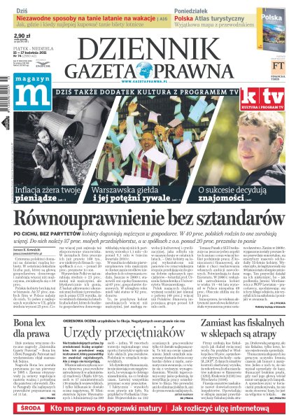 Niezawodne sposoby na tanie latanie na wakacje; po cichu i bez parytetów kobiety doganiają mężczyzn w gospodarce – w 40 proc. polskich rodzin to one zarabiają więcej; dziś zostaną wręczone doroczne nagrody „Dziennika Gazety Prawnej” – Bona lex i Złote Paragrafy; nie trzeba kolejnych ustaw, by zredukować liczbę urzędników – ich przełożeni mają instrument, który pozwoliłby im zwalniać najsłabszych; dlaczego firmy unikają kas fiskalnych jak diabeł święconej wody.
