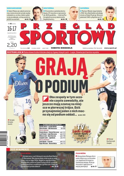 Lech Poznań i Legia Warszawa grają o podium; dziś pierwszy z serii hitowych meczów Real Madryt - FC Barcelona; hiszpańska Malaga oferowała milion euro za bramkarza Jagielonii Grzegorza Sandomierskiego; Adam Małysz po zakończeniu kariery może wreszcie żyć jak zwykły człowiek; Mariusz Wlazły i jego koledzy z PGE Skry Bełchatów odrabiają straty w finale PlusLigi.