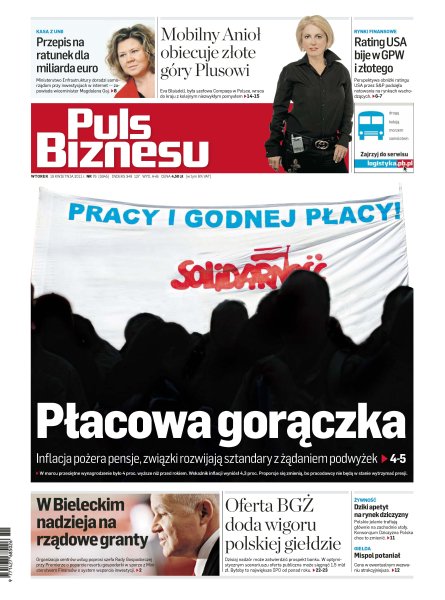 Inflacja pożera pensje a związki zawodowe rozwijają sztandary z żądaniami podwyżek; sektor usług biznesowych zwróci się do szefa Rady Gospodarczej przy Premierze o wsparcie systemu grantów; perspektywa obniżki długoterminowego ratingu Stanów Zjednoczonych osłabia warszawską giełdę i walutę; resort finansów doradzi samorządom przy gigantycznych inwestycjach.