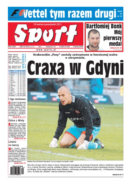 Arka Gdynia wygrała z Cracovią w meczu o utrzymanie; koszykarki Wisły Can Pack zostały mistrzyniami Polski; polscy hokeiści pokonali w Kijowie Litwinów 5:1, dzisiaj grają z Estonią; Real Madryt zremisował z Barceloną 1:1, w środę kolejne starcie; Manchester City odniósł zwycięstwo nad Manchesterem United w półfinale Pucharu Anglii; Bartłomiej Bonk zdobył brązowy medal w podnoszeniu ciężarów na mistrzostwach Europy; Justyna Kowalczyk wygrała maraton narciarski w Pietropawłowsku Kamczackim.