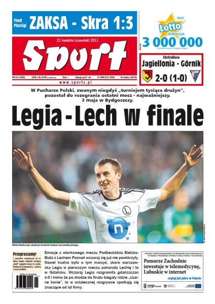 W Pucharze Polski pozostał do rozegrania ostatni mecz - najważniejszy, 3 maja w Bydgoszczy; piłkarze Legii wreszcie mieli powody do radości na własnym stadionie; deficyt młodych snajperów - analiza sytuacji w ekstraklasie; wywiad z Wojciechem Grzybem; to może być najlepszy sezon w historii Lille; najważniejsza walka w historii polskiego boksu zawodowego odbędzie się 10 września we Wrocławiu; siatkarze z Bełchatowa mają szansę zdobyć mistrzostwo Polski po raz siódmy z rzędu.