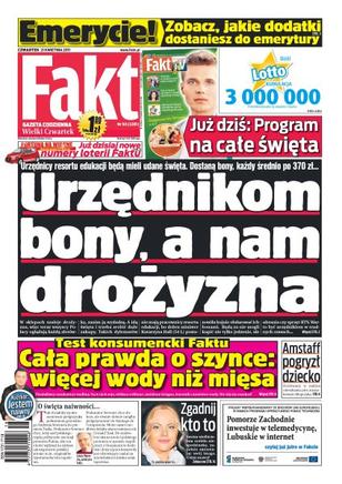 Urzędnicy resortu edukacji będą mieli udane święta, dostaną bony, każdy średnio po 370 zł; w sklepach coraz częściej pojawiają się oszukane wędliny, więcej w nich wody niż samego mięsa; hodowany w małym mieszkaniu pies zmasakrował chłopczyka; zobacz, jakie dodatki do emerytury prawnie ci się należą.