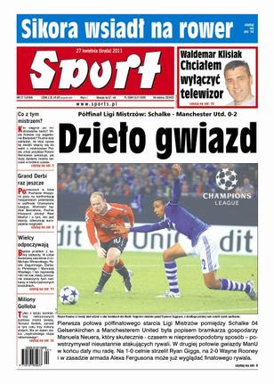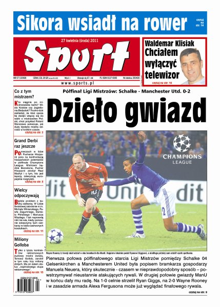 Manchester United pokonał Schalke 04 0:2 w pierwszym meczu półfinałowym Ligi Mistrzów; kto sięgnie po mistrzowskie berło, Wisła Kraków czy Jagiellonia Białystok; FC Barcelona czy Real Madryt, która z tych dwóch wielkich drużyn jest lepsza; polska kadra siatkarzy ma poważne problemu personalne; Tomasz Gollob zarobił w tym roku trzy miliony złotych z samych kontraktów reklamowych.