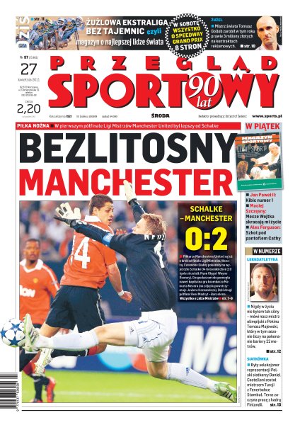 W pierwszym półfinale Ligi Mistrzów Manchester United pokonał na wyjeździe Schalke 04 0:2 i jest bliski gry w wielkim finale; Tomasz Gollob zarobił w tym roku trzy miliony złotych na samych kontraktach reklamowych; Tomasz Majewski zapowiada, że jeszcze nigdy nie czuł takiej mocy jak obecnie i zamierza pokonać barierę 22 metrów; były selekcjoner polskich siatkarzy Daniel Castellani został mistrzem Turcji z Fenerbahce Stambuł.
