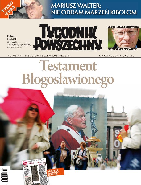 Temat Tygodnika: gdy państwo rujnuje przedsiębiorców; beatyfikacja Jana Pawła II: homilia Benedykta XVI, relacja ks. Adama Bonieckiego, rozmowa z Mirosławą Grabowską o pamięci Polaków o Papieżu, uroczystości w Łagiewnikach; przewodnik po Maryi; rozmowa z Leszkiem Balcerowiczem o tym, czego nas nauczyła debata o OFE; polskie konstytucje – co świętować 3 maja; Osama bin Laden nie żyje: terrorysta numer jeden, rozmowa z Romanem Kuźniarem o islamie, przemocy i zachodniej hipokryzji, rozmowa z Edwardem N. Luttwakiem, amerykańskim specjalistą ds. terroryzmu; rozmowa z Mariuszem Walterem, który deklaruje, że nie odda marzeń kibolom; czy nad Wisłą ma szanse powstać Grafenowa Dolina – na to pytanie próbuje odpowiedzieć Jacek Baranowski, współodkrywca polskiej technologii produkcji grafenu; Roman Graczyk odpowiada Andrzejowi Skworzowi i Jerzemu Skoczylasowi; 80 lat mistrza polskiej ilustracji: Bohdan Butenko prezentuje swój alfabet; Anita Piotrowska o święcie kina dokumentalnego, czyli 8. Planete Doc Film Festival.