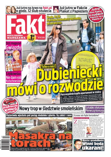 Ze słów Marcina Dubienieckiego wynika, że nie ma mowy o jego rozwodzie z Martą Kaczyńską – jak wygląda prawda; nowy trop w śledztwie smoleńskim – czy przyczyną tragedii była awaria komputera pokładowego; ciężarówka z cegłami wjechała wprost pod koła pociągu jadącego do Gdyni; sztabki złota – coraz częstszy prezent na Pierwszą Komunię; partie polityczne zbijają fortunę na naszych podatkach.
