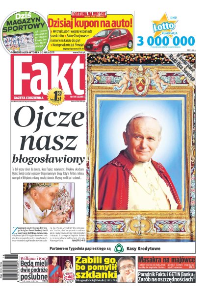 Nasz Papież został ogłoszony błogosławionym Sługą Bożym; zabili go, bo pomylił szklanki; William i Kate będą mieli dwie podróże poślubne; masakra na majówce; poradnik Faktu i Getin Banku o oszczędnościach.