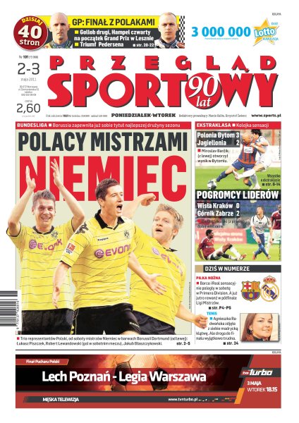 Polacy mistrzami Niemiec; Polonia Bytom pokonała Jagiellonię 3-2; Górnik Zabrze zwyciężył z Wisłą Kraków 2-0; już jutro rewanż Realu z Barceloną w półfinale Ligi Mistrzów; Agnieszka Radwańska zdjęła z siebie madrycką klątwę; Gollob drugi, Hampel czwarty na początek Grand Prix w Lesznie.
