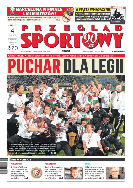 Piłkarze z Warszawy wygrali w finale z Lechem Poznań i zagrają w eliminacjach Ligi Europejskiej; Barcelona kontrolowała sytuację w meczu z Realem Madryt i awansowała do finału Ligi Mistrzów, który rozegrany zostanie 28 maja na Wembley; Rooney i Giggs na ławce rezerwowych, Berbatow i Owen w wyjściowej jedenastce – to roszady trenera MU przed rewanżem z Schalke; w półfinale PGNiG Superligi Vive Targi Kielce pokonało BRW Stal Mielec 40:29.