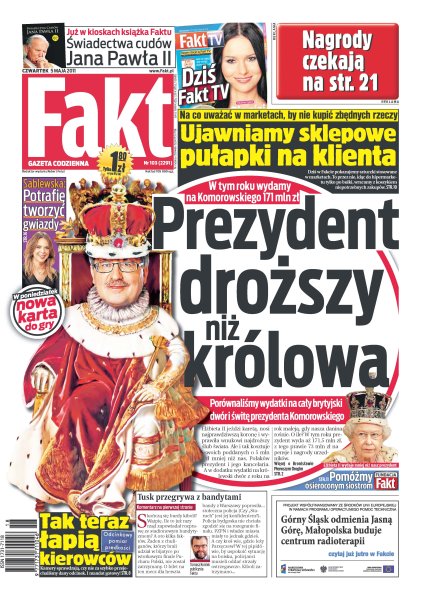 Zobacz, na co ci wystarczy niemiecka pensja; pakistańskie media podważają amerykańską wersję okoliczności śmierci Osamy bin Ladena, sugerując, że to było morderstwo z zimną krwią na bezbronnym; Aleksander Kwaśniewski dostał mandat; jakie są sklepowe pułapki; Maja Sablewska ma receptę na tworzenie gwiazd; Kora sprzedaje dom za 1,2 mln złotych; w Bydgoszczy kibole Lecha i Legii pokazali, że podczas imprez sportowych trzeba ich pilnować, bo są zagrożeniem dla innych; czy w przypadku rozwodu Kate dostanie pół królestwa.