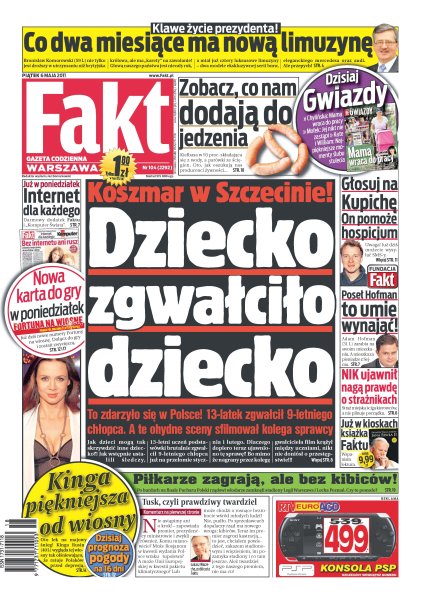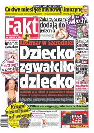 Koszmar w Szczecinie – dziecko zgwałciło dziecko; prezydent co dwa miesiące ma nową limuzynę; zobacz, co nam dodają do jedzenia; Kinga piękniejsza od wiosny; piłkarze zagrają, ale bez kibiców; Tusk czyli prawdziwy twardziel; głosuj na Kupichę – on pomoże hospicjum; NIK ujawnił nagą prawdę o strażnikach; poseł Hofman to umie wynająć.