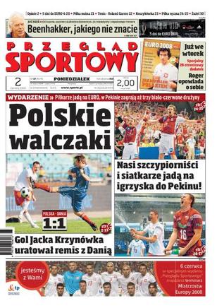Szczypiorniści i siatkarze wywalczyli awans do Pekinu, 1:1 z Danią - wróżba lepsza niż ta sprzed dwóch lat, debata byłych selekcjonerów na temat szans reprezentacji przed finałami Euro, prawdziwa historia życia Leo Beenhakkera: ulubieniec dziewcząt w butach od pomocy społecznej, obolała Agnieszka Radwańska przegrała w czwartej rundzie, rekord świata na 100 m Usaina Bolta, Paweł Czapiewski uzyskał minimum olimpijskie.