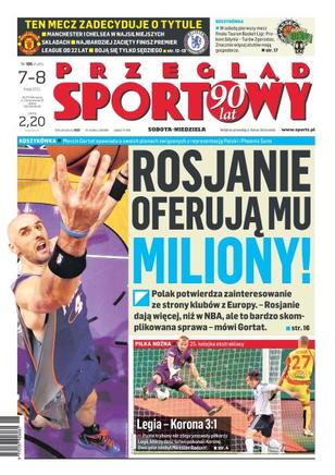Rosjanie oferują Marcinowi Gortatowi miliony; Legia pokonała Koronę 3:1; w sobotę pierwszy mecz finału Tauron Basket Ligi – zmierzą się Prokom Gdynia z Turowem Zgorzelec; ten mecz zadecyduje o tytule – Manchester i Chelsea w najsilniejszych składach.