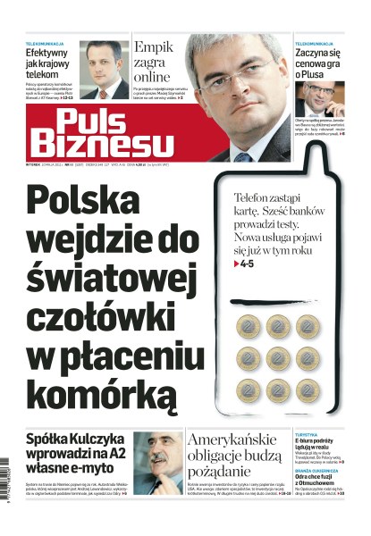 Polska wejdzie do światowej czołówki w płaceniu komórką; spółka Kulczyka wprowadzi na A2 własne e-myto; efektywny jak krajowy telekom; Empik zagra online; zaczyna się cenowa gra o Plusa; amerykańskie obligacje budzą pożądanie; e-biura podróży lądują w realu; Odra chce fuzji z Otmuchowem.