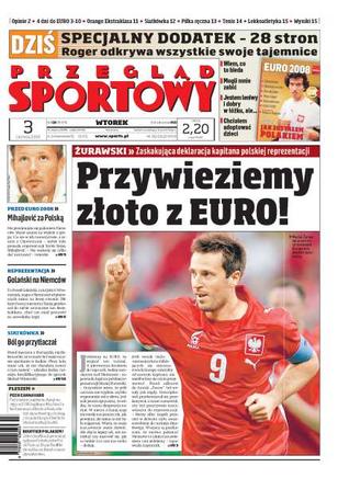 Maciej Żurawski obiecuje złoto na Euro, kadra już trenuje w Austrii, Oliver Neuville znowu chce nam strzelić bramkę, prawdziwa historia Leo Beenhakkera cz. 2, bilans piłkarzy ręcznych w turnieju kwalifikacyjnym, rosną zarobki Agnieszki Radwańskiej.