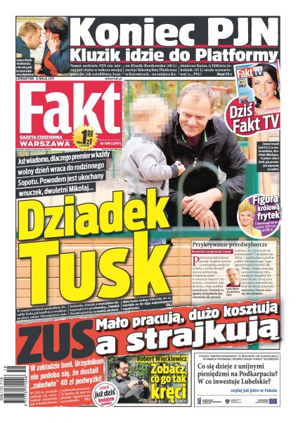 Już wiadomo, dlaczego premier w każdy wolny dzień wraca do rodzinnego Sopotu; ZUS – mało pracują, dużo kosztują, a strajkują; zobacz, co kręci Roberta Więckiewicza; koniec PJN – Kluzik idzie do Platformy; Figura królową frytek.
