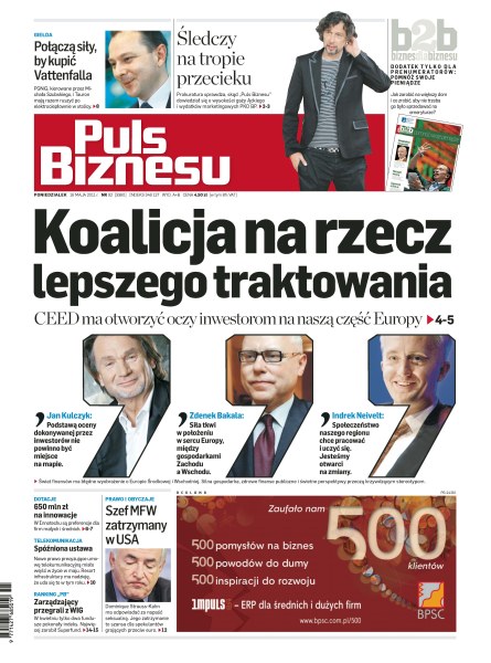 PGNiG, kierowane przez Michała Szubskiego, i Tauron mają razem ruszyć po elektrociepłownie w stolicy; prokuratura sprawdza, skąd „Puls Biznesu” dowiedział się o wysokości gaży Ąckiego i wydatków marketingowych PKO BP; CEED ma otworzyć oczy inwestorom na naszą część Europy ; nowe prawo precyzujące umowę telekomunikacyjną miało wejść wżycie w maju, resort infrastruktury ma nadzieję, że uda się to w tym roku.