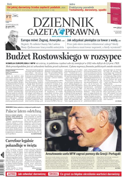 Komisja Europejska i MFW nie wierzą, że polskiemu rządowi uda się zmniejszyć w 2012 roku deficyt do 2,9 proc.; po zabiciu Osamy bin Ladena Stany Zjednoczone tracą resztki autorytetu; jak odzyskać pieniądze za towar z wadą, przez jaki okres można reklamować zakup; dziura w ustawie antynikotynowej: zakaz palenia nie obejmuje restauracyjnych ogródków; sieć Carrefour znalazła sposób na obejście zakazu handlu w święta.