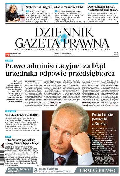 Rozmowa z szefową UKE Magdaleną Gaj; część zysków płynących z procederu unikania opodatkowania może trafiać do organizacji terrorystycznych – uważa dr hab. Dominik Gajewski ze Szkoły Głównej Handlowej; prawo administracyjne - za błąd urzędnika odpowie przedsiębiorca; Kreml nie wyklucza żadnego scenariusza w związku z tragedią airbusa na Synaju - także zamachu - łączenie wypadku z zemstą za wojnę w Syrii to dla prezydenta Rosji najgorszy scenariusz; jutro sędziowie rozpoczynają dwudniowe posiedzenie, w trakcie którego zdecydują, czy przekazanie obligacji do ZUS było zgodne z konstytucją; kradzież, która była przestępstwem, w chwili jej osądzania może być już tylko wykroczeniem, a wszystko przez próg kradzieży - ustalając go na jedną czwartą minimalnej pensji, nie dopisano, że chodzi o płacę obowiązującą w momencie popełniania czynu.
