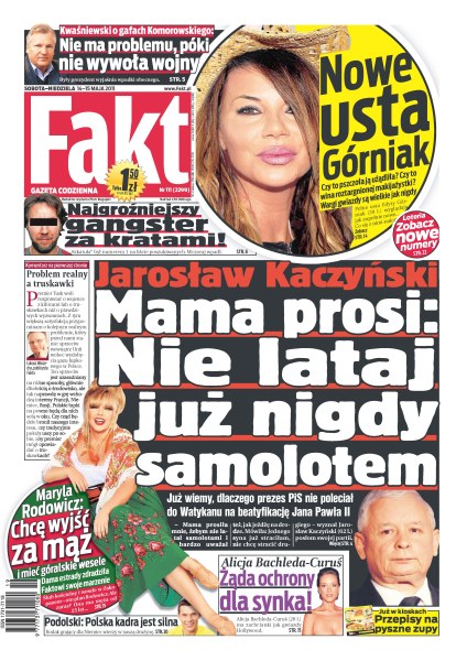 W czasie pracy parlamentarzyści grają i esemesują, a marszałek leni się w parku; matka Jarosława Kaczyńskiego prosi syna, żeby nie latał samolotem; Donald Tusk reality show; wczoraj w ręce policji wpadł największy gangster „Szkatuła”; czy Edyta Górniak ma nowe usta; Alicja Bachleda-Curuś zażądała ochrony dla synka; PZPN chce zedrzeć z kibiców za bilety; jak szybko pędzą żużlowcy.
