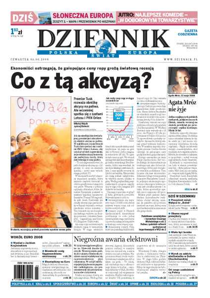 Zmarła Agata Mróz-Olszewska, Lech Kaczyński: Wałęsa to Bolek, rozczarowanie po ujawnieniu raportu Julii Pitery, awaria w elektrowni atomowej w Słowenii, rosnące ceny ropy grożą światową recesją, decydują się losy politycznej kariery Hillary Clinton, w sobotę w Warszawie koncert Boba Dylana, Jerzy E. junior zatrzymany pod zarzutem korupcji, polscy piłkarze są pełni optymizmu przed meczem z Niemcami.