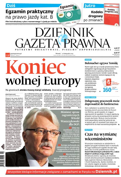 Koniec wolnej Europy – na granicach znowu muszą stanąć szlabany, bo inaczej przegramy; rozmowa z Witoldem Waszczykowskim, ministrem spraw zagranicznych; bukmacher ogrywa Temidę: nawet sądy nie są w stanie powstrzymać firm nielegalnie organizujących gry hazardowe; kary nakładane na polskie firmy, które wysyłają swoich pracowników do Francji czy Niemiec, są tak wysokie, że mogą je doprowadzić do upadłości; wczorajsze nominacje na ministrów to dopiero początek wymiany kadr w resortach, w ciągu najbliższych tygodni decyzje będą dotyczyły szczebla podsekretarzy stanu.
