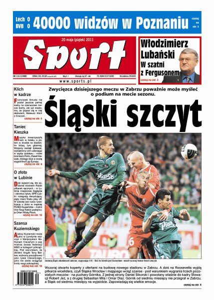 Zwycięzca dzisiejszego meczu Śląsk Wrocław – Górnik Zabrze może na poważnie zacząć myśleć o grze w europejskich pucharach; Franciszek Smuda nie podał jeszcze pełnej kadry na czerwcowe mecze kadry, ale już wiadomo, że pojawi się w niej debiutant, Mateusz Klich z Cracovii; dziś wyjaśni się, kto zostanie mistrzem Polski piłkarek ręcznych – w Lubinie miejscowe Zagłębie i obrońca tytułu SPR Lublin rozegrają decydujący, piąty mecz finału play off; Aleksy Kuziemski może jutro w Londynie walczyć z Walijczykiem Nathanem Cleverlym o pas mistrza świata federacji WBO w kategorii półciężkiej.