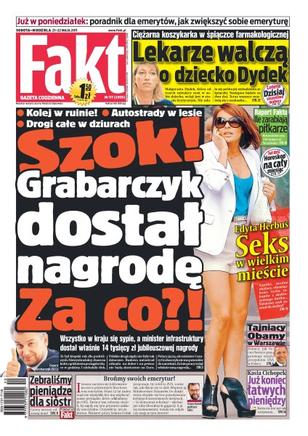 Minister infrastruktury Cezary Grabarczyk dostał 14 tys. zł jubileuszowej nagrody; koszykarka Małgorzata Dydek utrzymywana jest w stanie śpiączki farmakologicznej, lekarze walczą o jej dziecko; raport Faktu – ile zarabiają piłkarze; jak Secret Service przygotowuje wizytę Baracka Obamy w Warszawie; Kasia Cichopek nie jest już tak rozrywana przez media; dziś wchodzą w życie przepisy, które dają rowerzystom pierwszeństwo na drogach.