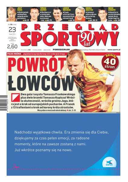 Wisła Kraków będzie rozstawiona w II i III rundzie eliminacji Ligi Mistrzów; Kolejorz stracił szansę na występ w europejskich pucharach; Legia Warszawa wygrała z Wisłą Kraków; rozmowa z Andreą Anastasim, selekcjonerem polskiej reprezentacji siatkówki; dzisiaj poznamy mistrza Polski w koszykówce; Betty Heidler pobiła rekord świata w rzucie młotem; Maja Włoszczowska była szósta w kolarskich zawodach o Puchar Świata; Aleksy Kuziemski nie został mistrzem świata w WBO.