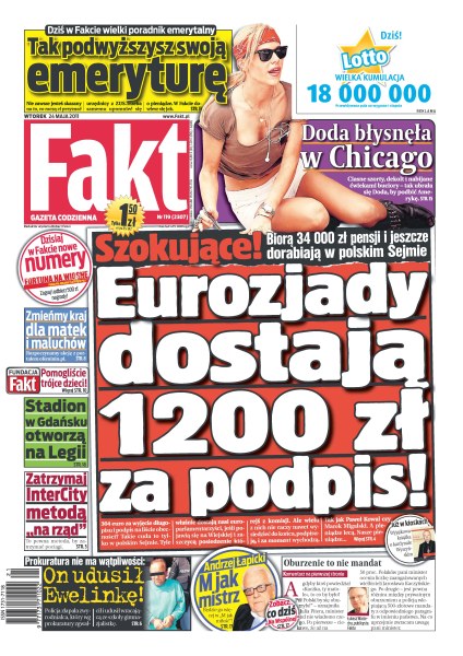 Europosłowie dostają 1200 zł za podpis; Doda wystąpiła w Chicago; policja złapała mordercę i gwałciciela nastolatki z Warmii; Grzegorz Schetyna walczy o wpływy w PO; jakie są problemy polskich matek; koleżanki torturowały panią Annę; jak podwyższyć swoją emeryturę; Anna Dereszowska nagrywa płytę; na przełomie września i października polska reprezentacja piłki nożnej zagra z Zambią na stadionie żużlowym w Rzeszowie; każda Brytyjka chce mieć pupe jak Pippa Middleton.