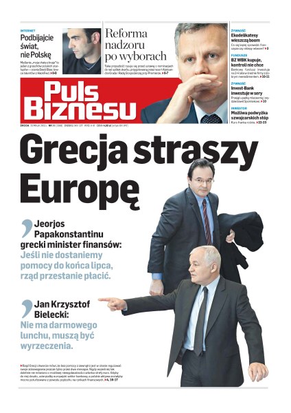 Invest-Bank inwestuje w sery; kurs franka szwajcarskiego rośnie; Grecy szantażują Europę; nadchodzi ekoboom, polski rynek ekoproduktów jest na tyle silny, że można na nim zarabiać; 500 lotów odwołano wczoraj w Europie z powodu pyłu z islandzkiego wulkanu; koalicja ma dziś rozmawiać o zmianach w nadzorze nad państwowymi spółkami; przeciąga się zmiana prawa bankowego, która stoi na drodze przejęcia Polbanku przez Raiffeisen.