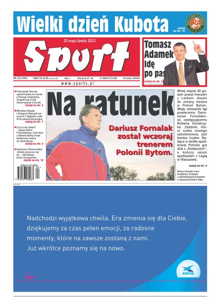 Dariusz Fornalak został trenerem Polonii Bytom; Franciszek Smuda ogłosił kadrę na mecze z Francją i Argentyną; Mirosław Stasiak i Grzegorz Bartczak zostali wyrzuceni z Zagłębia Lubin; siatkarka Katarzyna Skowrońska-Dolata przenosi się do chińskiego klubu Evergrande; Tomasz Adamek i Witalij Kliczko spotkali się na pierwszej konferencji; Alberto Contador wygrał jazdę indywidualną na czas w wyścigu Giro d'Italia; Łukasz Kubot zagrał perfekcyjnie w pierwszej rundzie French Open.