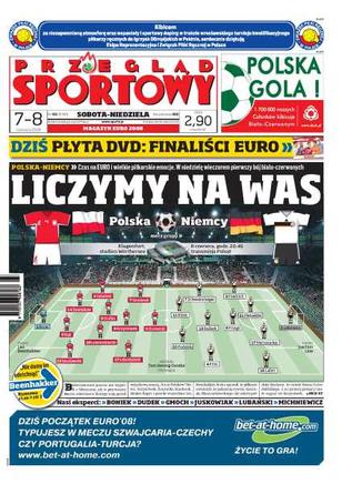 Czekamy na mecz Polska-Niemcy, zestawienie podstawowych jedenastek obu drużyn, wywiady z trenerami Leo Beenhakkerem i Joachimem Loewem, ostatnie wypowiedzi zawodników i opinie ekspertów, mecze w innych grupach, Jerzy Janowicz w finale Roland Garros, Otylia Jędrzejczak druga w Rzymie, Robert Kubica przed wielką szansą na pierwsze zwycięstwo, Łukasz Kadziewicz podpisał dwuletni kontrakt.