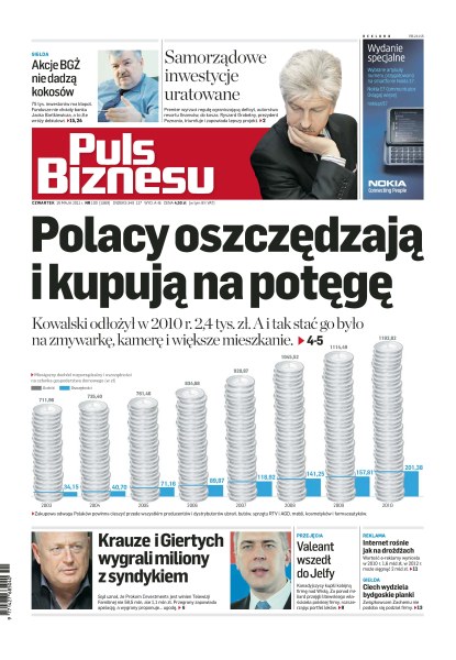 Polacy coraz więcej oszczędzają; wartość reklamy w Internecie wzrasta, w 2012 r. może sięgnąć 2 mld zł.; sąd uznał, że Prokom Investment jest winien Telewizji Familijnej 1,1 mln zł; wiele wskazuje na to, że reguła samorządowa, którą chciał wprowadzić resort finansów, odejdzie w niebyt; na odcinku Nowy Tomyśl-Świecko autostrada rośnie o kilometr dziennie; Valeant Pharmaceuticals za ponad 1 mld zł kupił właściciela Jelfy; obawy przed skutkami wybuchu wulkanu są przesadzone.