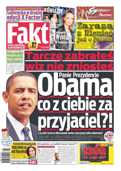Czy dziś i jutro znów usłyszymy od Baracka Obamy puste obietnice dotyczące zniesienia wiz do USA dla Polaków; podczas wizyty prezydenta USA premier Donald Tusk będzie mógł sprawdzić stan swojej znajomości języka angielskiego; Joanna Mucha pożyczyła 100 000 zł od swojego faceta; śmiertelna zaraza dotarła do Polski; Maja Sablewska weźmie udział w kolejnej edycji programu „X-factor”.
