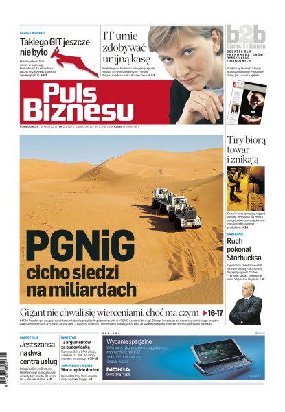 PGNiG cicho siedzi na miliardach; takiego GIT jeszcze nie było; IT umie zdobywać unijną kasę; tiry biorą towar i znikają; Ruch pokonał Starbucksa; jest szansa na dwa centra usług; 13 argumentów za budowlanką; woda będzie drożeć.
