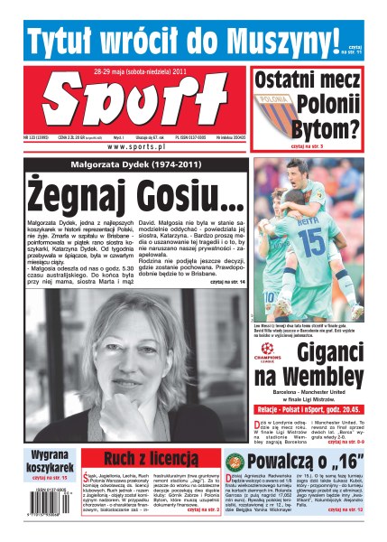 Małgorzata Dydek, jedna z najlepszych koszykarek w historii reprezentacji Polski, nie żyje; kilku piłkarzy Górnika może jutro po raz ostatni pokazać się kibicom na Roosevelta; na starym Wembley Manchester United i FC Barcelona po raz pierwszy wywalczyły Puchar Mistrzów - dzisiaj na nowym obiekcie mają szansę zdobyć trofeum po raz czwarty; Jose Mourinho pomaga Alexowi Fergusonowi rozpracować Barcelonę.