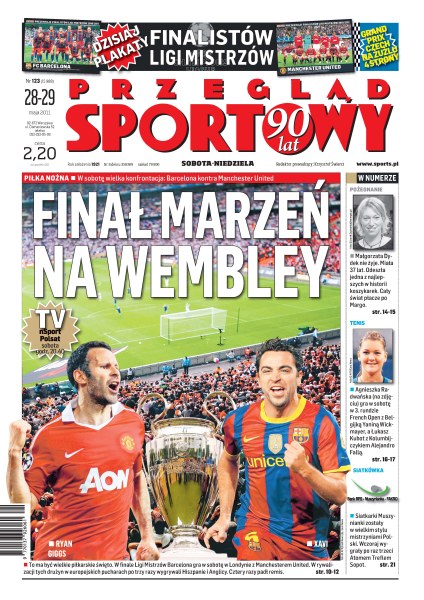 Małgorzata Dydek, jedna z najlepszych polskich koszykarek, nie żyje; już dziś wielka konfrontacja na Wembley, w finale Ligi Mistrzów Manchester United zmierzy się z FC Barceloną; Agnieszka Radwańska zagra w 3. rundzie French Open z Belgijką Yaniną Wickmayer, a Łukasz Kubot z Kolumbijczykiem Alejandro Fallą; siatkarki Muszynianki zostały w wielkim stylu mistrzyniami Polski: wczoraj wygrały po raz trzeci z Atomem Treflem Sopot.