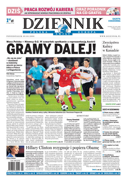 Polska na Euro 2008: dobry mecz mimo przegranej; zwycięstwo Roberta Kubicy; Hillary Clinton zawiesza kampanię; nowe zasady oceniania na lekcjach religii; dlaczego pocztowcy strajkują; niezbędnik - kredyty wakacyjne; Michel Houellebecq w Polsce - kalendarium spotkań z czytelnikami; wywiad z Maxem Cavalera przed koncertem grupy braci w Warszawie.