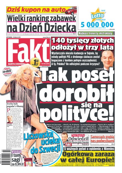 Poseł odłożył 140 tysięcy złotych w trzy lata; Liszowska ucieka do Szwecji; wielki ranking zabawek na Dzień Dziecka; ogórkowa zaraza w całej Europie; Piotr Kupicha odwiedził hospicjum; samorządy gnębią nas podwyżkami; najlepsi trenerzy ekstraklasy.