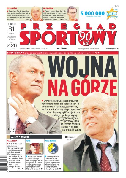 Trener reprezentacji Franciszek Smuda może stać się ofiarą gierek personalnych w PZPN; wicemistrz Polski Śląsk Wrocław rozpoczyna batalię o zatrzymanie trenera Oresta Lenczyka i bramkarza Mariana Kelemena; trener Laurent Blanc ostro trzyma w ryzach reprezentantów Francji; Wisła Kraków w eliminacjach Ligi Mistrzów zacznie grać 12 lub 13 lipca; Agnieszka Radwańska po emocjonującym meczu przegrała w IV rundzie French Open z Rosjanką Marią Szarapową; Vive Targi Kielce stara się o udział w turnieju kwalifikacyjnym Ligi Mistrzów.
