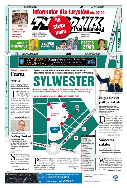 Agenci ochrony, policja, straż pożarna - wszystkie służby postawione na nogi za sprawą zakopiańskiej zabawy sylwestrowej; cztery osoby zginęły w górach w ciągu sześciu dni – warunki na szlakach są ekstremalnie trudne; zazwyczaj dudki płyną z Ameryki do Polski – teraz jest odwrotnie, pora, byśmy otworzyli serca dla osoby za Wielką Wodą, która potrzebuje pomocy; Magda Gessler podbija Podhale – znana restauratorka i autorka popularnego programu „Kuchenne Rewolucje” otworzyła restaurację w Bukowinie Tatrzańskiej; miało być pełne wyżywienie, dwuosobowe pokoje w Zakopanem i prezenty rozdawane przez Mikołaja.