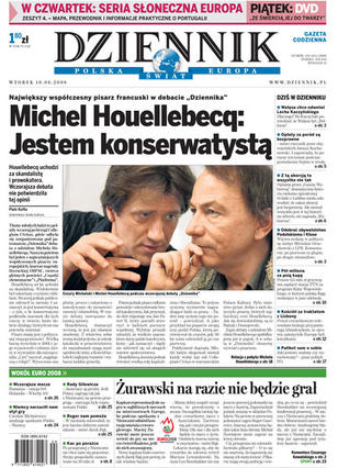Michel Houellebecq w debacie Dziennika; Polacy na Euro 2008: Maciej Żurawski wyłączony z gry, analiza meczu z Niemcami, nadzieja w Rogerze Guerreiro; Lech Wałęsa grozi prezydentowi sądem; przegrany mecz kosztował Polaków 50 mln złotych; mamy już ponad 150 tys. „eurosierot”.