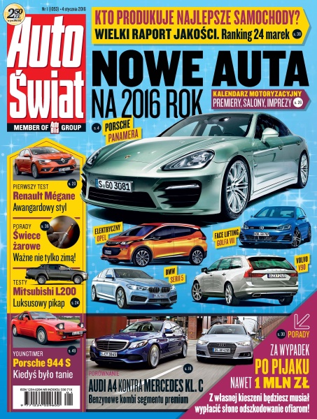 Porsche Panamera – druga generacja luksusowej limuzyny; Renault: Sport R.S. 01 i Alpine; aktualności ze świata motoryzacji; Audi A4 Avant i Mercedes klasy C T – porównanie kombi klasy średniej premium; Renault Mégane – pierwszy test nowego francuskiego kompaktu; Honda CR-V – japoński SUV z dieslem 1.6; Mitsubishi L200 – pierwszy test pikapa nowej generacji; VW Golfy Varianty: R i GTD – mocne wersje Golfa kombi: benzyniak i diesel; Wielki Raport Jakości – bierzemy pod lupę 24 marki samochodowe.