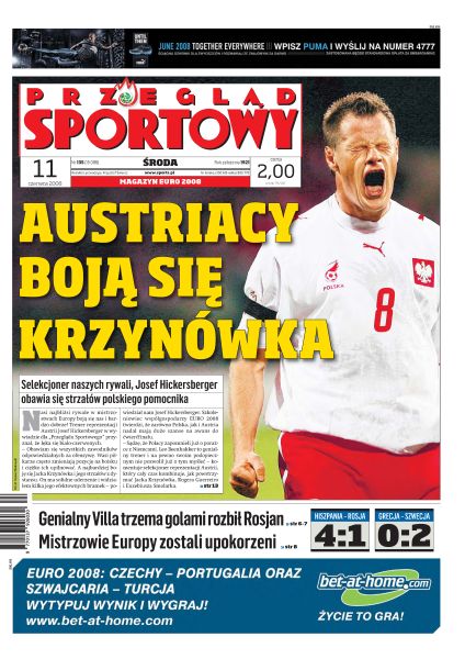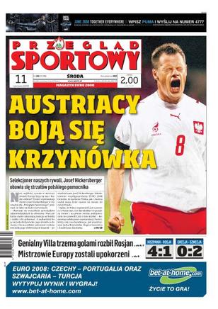 Selekcjoner reprezentacji Austrii obawia się Jacka Krzynówka; Polacy przed czwartkowym meczem: misja dla Rogera Guerreiro, kontuzjowany Mariusz Lewandowski walczy z czasem; pierwszy hat trick na Euro 2008: David Villa bohaterem meczu Hiszpania-Rosja; komentarze przed meczami Szwajcaria-Turcja i Czechy-Portugalia; Włosi analizują przegraną z Holandią; Robert Kubica i jego trzej rywale do tytułu mistrza świata - plusy i minusy zawodników; awantura w kadrze siatkarek, Marco Bonitta odesłał ze zgrupowania trzy zawodniczki.