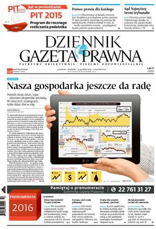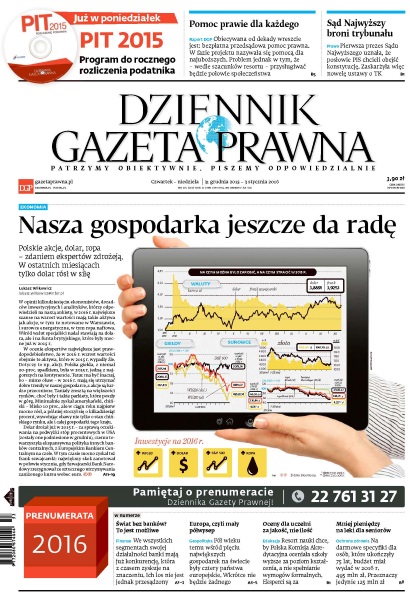 Miliony Polaków otrzymają noworoczny prezent - obiecywaną od lat bezpłatną pomoc prawnika; pierwsza prezes Sądu Najwyższego uznała, że posłowie PiS chcieli obejść konstytucję - zaskarżyła więc nowelę ustawy o TK; polskie akcje, dolar, ropa – zdaniem ekspertów zdrożeją - w ostatnich miesiącach tylko dolar rósł w siłę; we wszystkich segmentach swojej działalności banki mają już konkurencję, która z czasem zyskuje na znaczeniu - ich los nie jest jednak przesądzony; pół wieku temu wśród pięciu największych gospodarek na świecie były cztery państwa europejskie - wkrótce nie będzie żadnego; resort nauki chce, by Polska Komisja Akredytacyjna oceniała szkoły wyższe za poziom kształcenia, a nie spełnianie wymogów formalnych; na darmowe specyfiki dla osób, które ukończyły 75 lat, budżet miał wydać w 2016 r. 495 mln zł. - przeznaczy jedynie 125 mln zł.Gazeta Prawna, Kadry i Płace, Prawo Na Co Dzień..