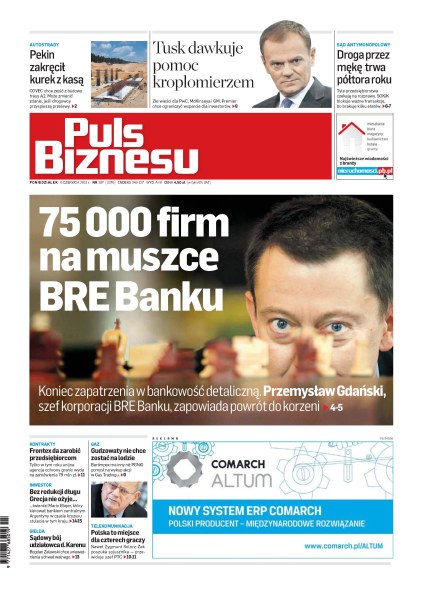 75 000 firm na muszce BRE Banku; Pekin zakręcił kurek z kasą; Tusk dawkuje pomoc kroplomierzem; droga przez mękę trwa półtora roku; Frontex da zarobić przedsiębiorcom; bez redukcji długu Grecja nie ożyje; Gudzowaty nie chce zostać na lodzie; sądowy bój udziałowca d. Karenu; Polska to miejsce dla czterech graczy.