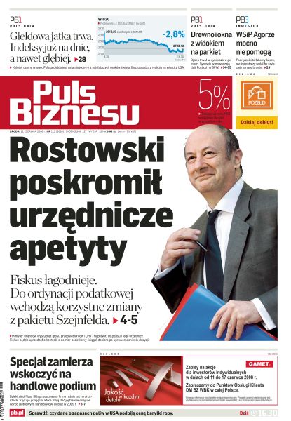 Ministerstwo Finansów wycofało się z niekorzystnych dla podatników zapisów w zmienianej ordynacji podatkowej. Sąd rozpatruje wniosek o zniesienie zabezpieczenia na akcjach Polkomtela. Debiut giełdowy: Pozbud T&R. Green IT staje się najmodniejszym trendem w branży. Do 2010 r. w Europie będzie szersza pula adresów internetowych dzięki nowemu protokołowi IPv6. Zarządzanie jakością, rodzaje standardów i potwierdzenie ich autentyczności. Polski rynek akcji nadal jednym z najsłabszych na świecie.