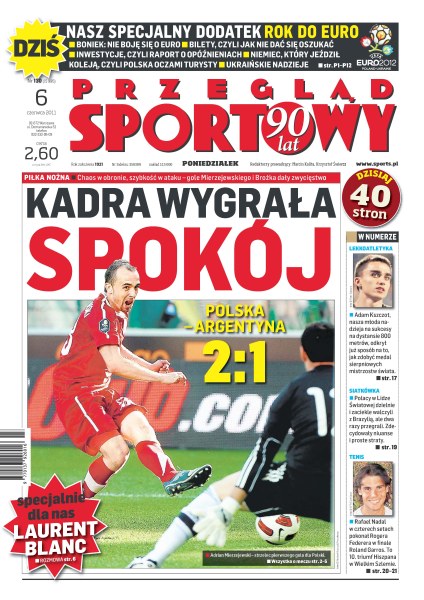 Kadra wygrała z Argentyną 2-1; Adam Kszczot odkrył sposób, jak zdobyć medal sierpniowych mistrzostw świata; Polacy w Lidze Światowej dzielnie i zaciekle walczyli z Brazylią; Rafael Nadal w czterech setach pokonal Rogera Federera w finale Roland Garros; Zbigniew Boniek nie boi się Euro.